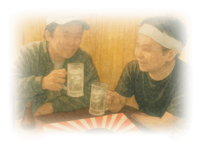 常連の男と、大将がいつものようにグラスを傾けながら、ぽつりぽつりと話す夜。