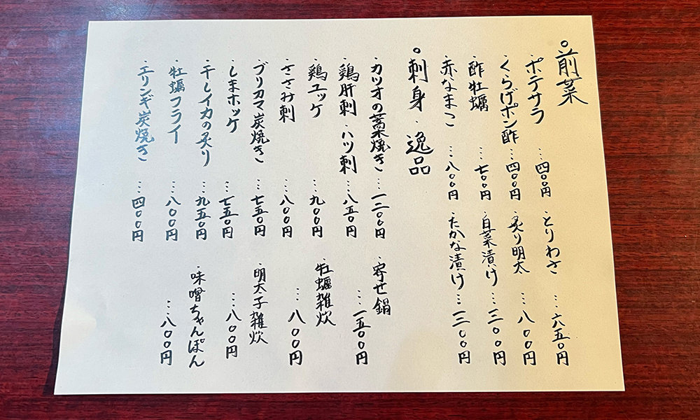 メニューはなんと、大将が毎日直筆で書き上げるこだわりの一枚です。